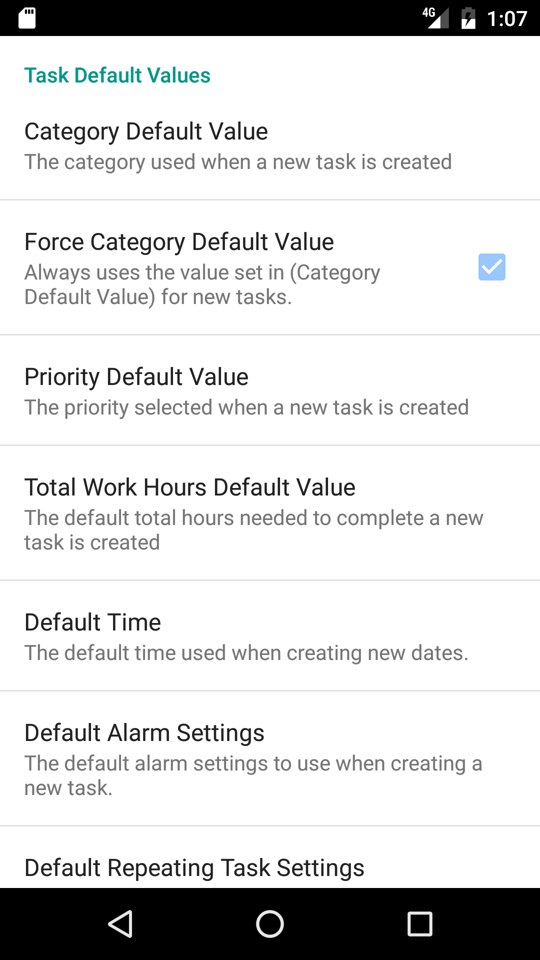 - The ‘Category Default Value’ allows you to select the category of a new task.