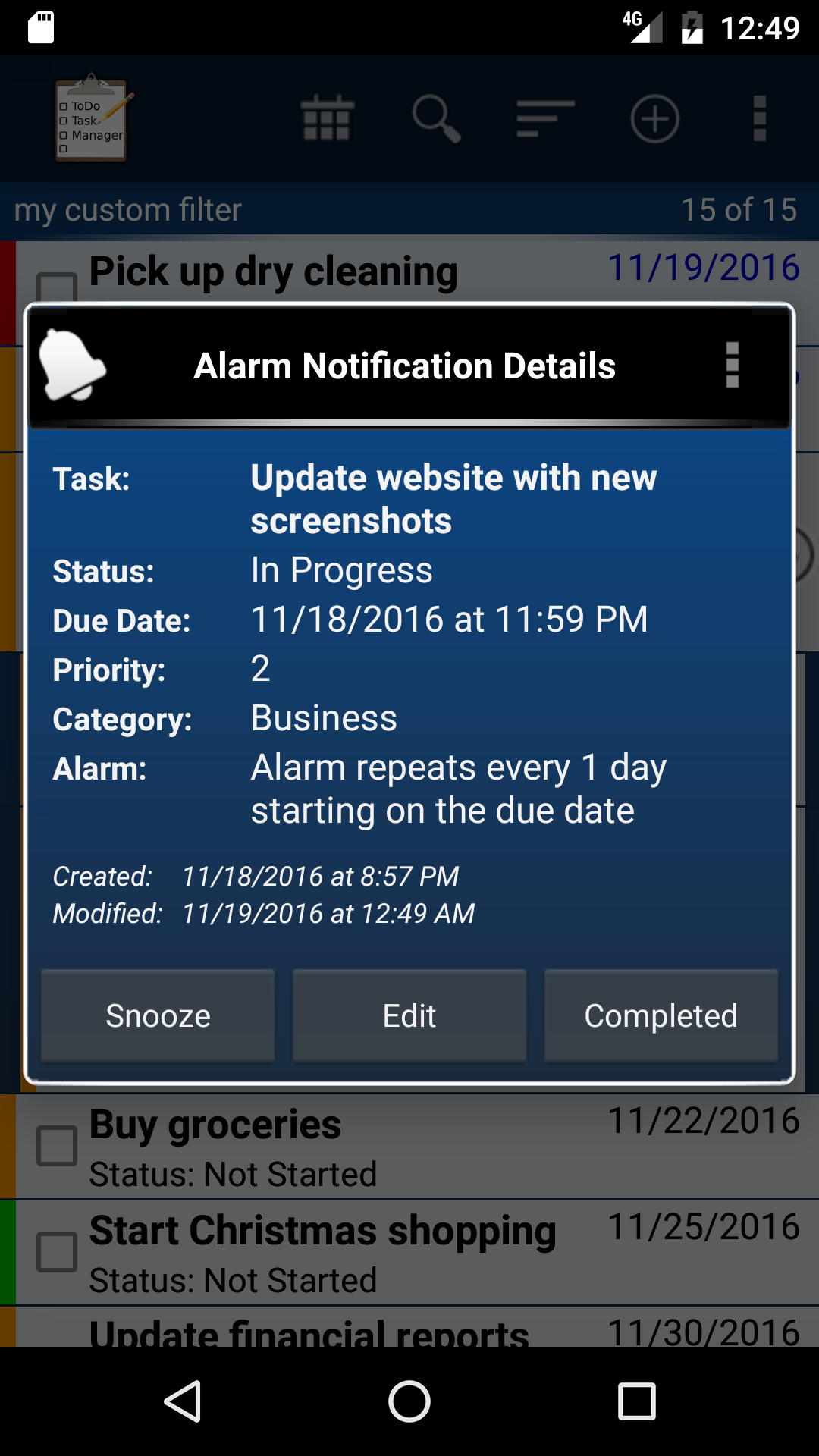 The alarm notification screen works the same as the task detail view screen. The only difference is the addition of the snooze button.| ← Previous | Index | Next → |